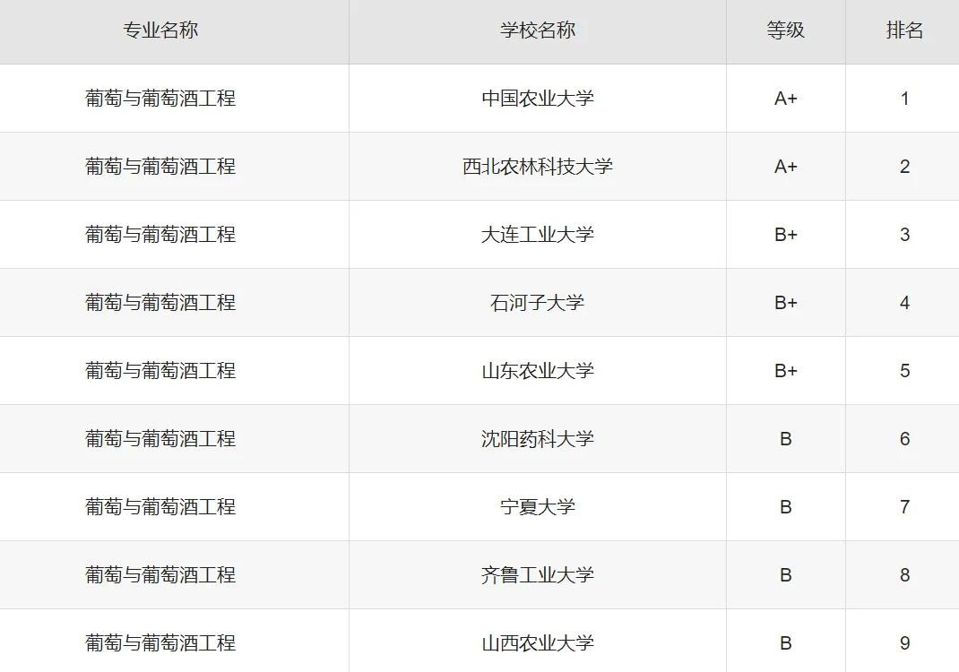 目前国内本科阶段开设此专业的高校约有15所,其中不乏中国农业大学、西北农林科技大学这样的985名校,以及大连工业大学、山东农业大学、沈阳药科大学等不同类型的院校。根据软科中国2023年发布的专业排名,葡萄与葡萄酒工程专业近两年国内综合实力最强的头部高校有以下这几所: