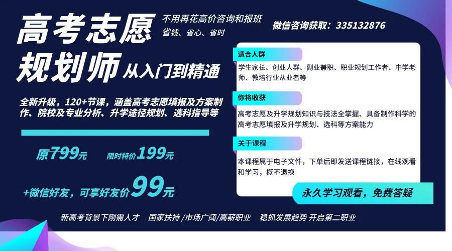 如果你也想要成为一名高考志愿规划师(高报师),或者想要系统的学习高考志愿填报及升学规划相关的课程,不需要花几千块去机构培训学习,重磅福利来了!高考志愿规划师从入门到精通课程全新升级!原价799元,全网限时优惠价仅¥199元,+微信好友可享¥99元特价!限时优惠,额满即止!