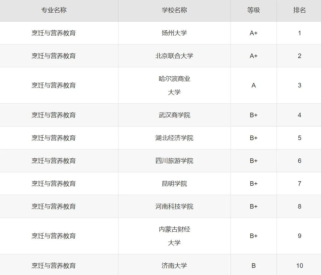 目前国内开设此专业的本科院校共计约26所,其中最著名,也是教学水平最高的应该要数扬州大学和北京联合大学,它们在2023年的软科中国大学排行榜上烹饪与营养教育学科评分均拿到A+。其他本专业综合实力相对靠前的院校还包括以下这些: